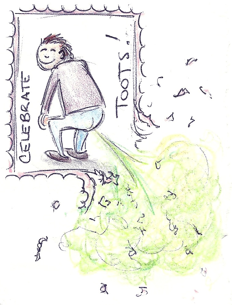 My sleepy, hard work on tasteless subject matter often paid off, though. Case in point: I discarded three envelopes before I finally got the right amount of explosive, flatulent pressure needed for “Celebrate Toots.” To this day, my son considers it to be my masterpiece.