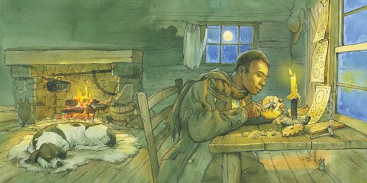 There’s one of Benjamin Banneker working by firelight in Ticktock. Oh – and the magenta, pre-dawn vignette of Rettie mopping the stairs in Rettie and the Ragamuffin Parade. I woke up one morning with that image in my head, that bright magenta and the stairs. That’s cool when that happens, when the vision makes it to the page. It’s rare.