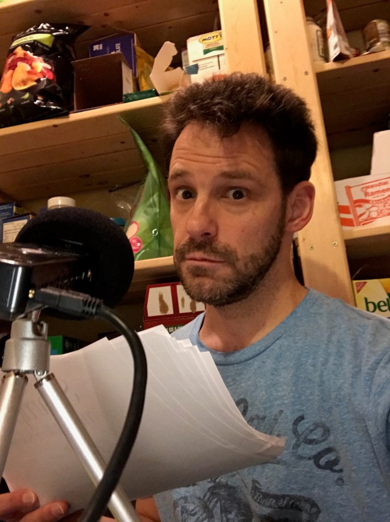 Me recording the audiobook for Scampers Thinks Like a Scientist. Yes, I’m recording in my pantry. It was the only room in the house where I couldn’t hear the whine of my neighbor’s stupid weedwacker.