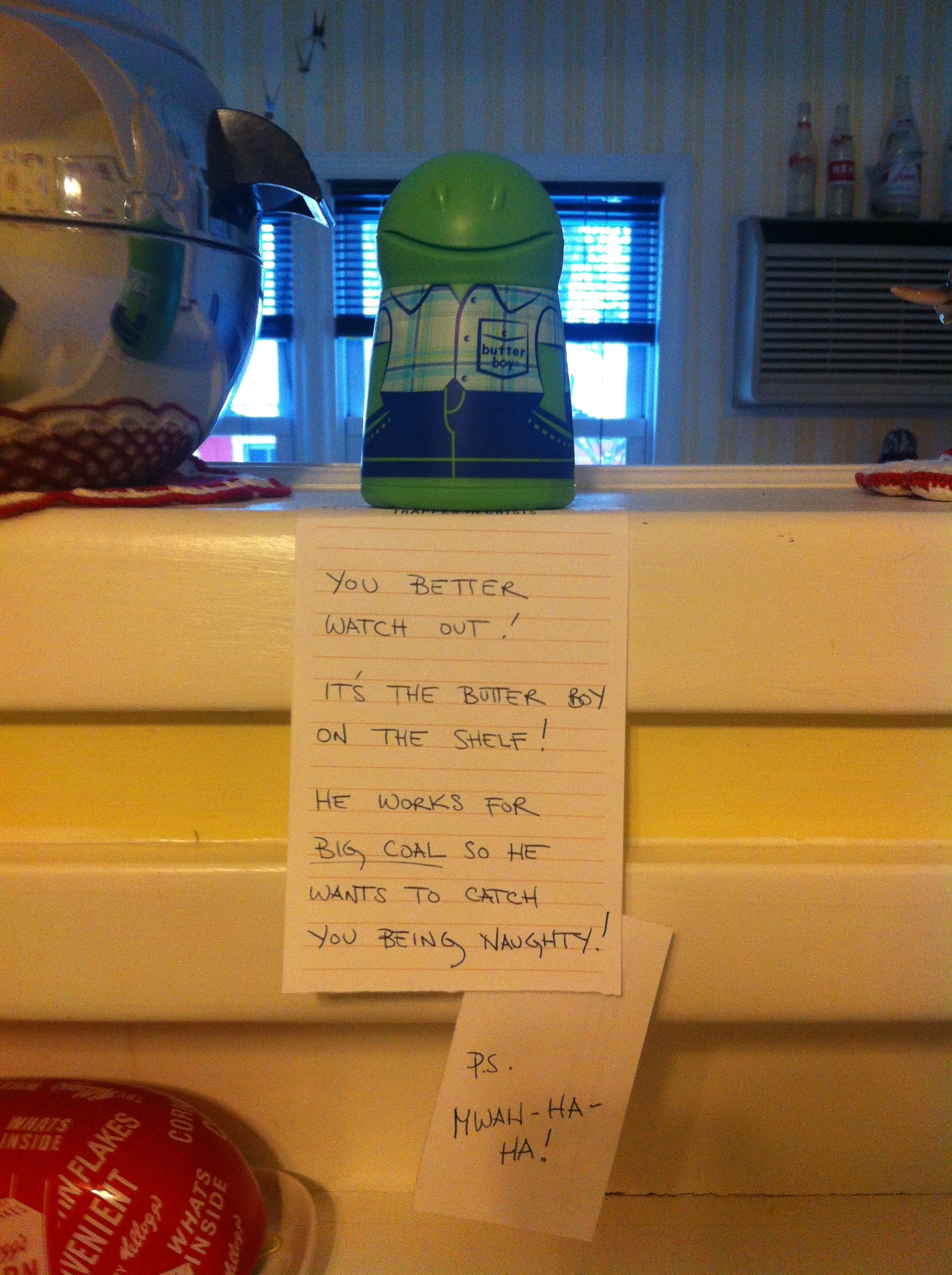 Butter Boy is perhaps the most useless kitchen gadget ever. You shove a stick of butter in his head and it allows you to easily butter your corn on the cob. Since corn on the cob season is over, I offered B.B. some seasonal work.